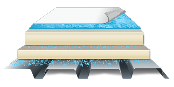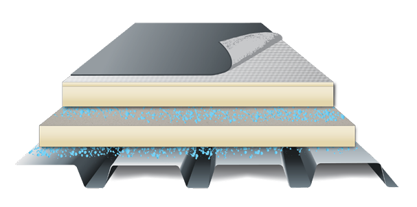 Sure-Flex PVC is installed over a steel deck using a fully adhered attachment method. This design delivers maximum redundancy with multiple protective layers, exceptional fire resistance, and long-lasting durability.